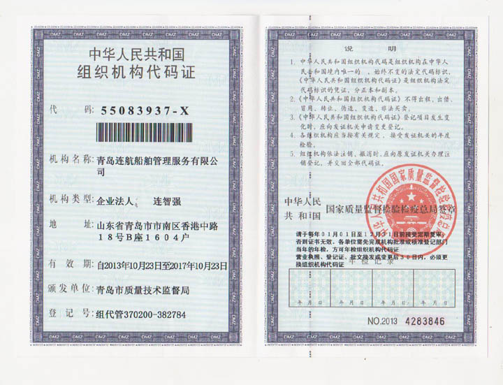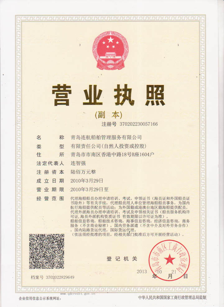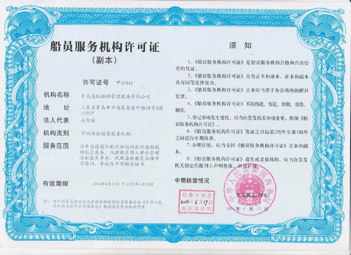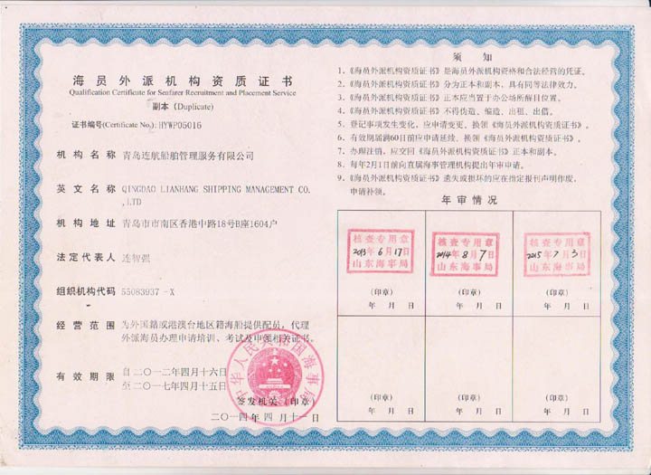 2012年04月青島連航船舶管理服務有限公司取得《海員外派機構資質(zhì)證書》,為海洋船舶提供配員,代理船員用人單位管理海洋船舶船員事物,代理海洋船舶船員申請培訓、考試、申請證書等業(yè)務。