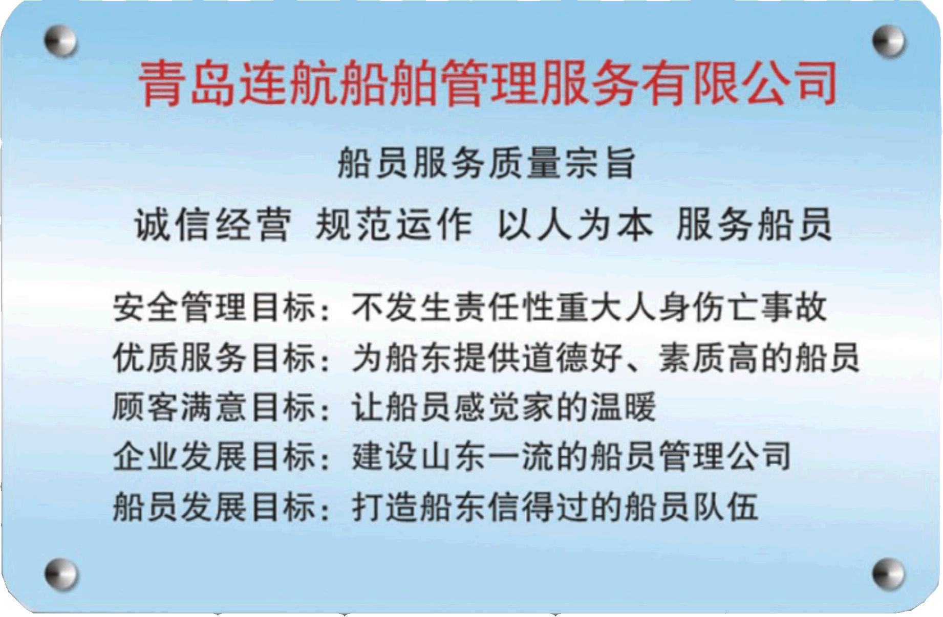 青島連航船舶管理服務有限公司(以下簡稱公司)是經(jīng)中華人民共和國海事局批準認可的海員外派服務機構(海員外派資質(zhì)證書編號:HYWP05016),是國家工商行政管理局注冊批準的股份制企業(yè),注冊資金600萬元。公司主要業(yè)務是代理海船船員辦理申請培訓、考試、申領證書等有關手續(xù),代理船員用人單位管理海船船員事務,為國內(nèi)外航行海船提供配員與輸出等活動;同時提供信息咨詢、船舶技術咨詢、海事信息咨詢、經(jīng)濟信息咨詢、商務服務、船舶物料供應、船舶維修、船舶代理貨運代理等服務業(yè)務。